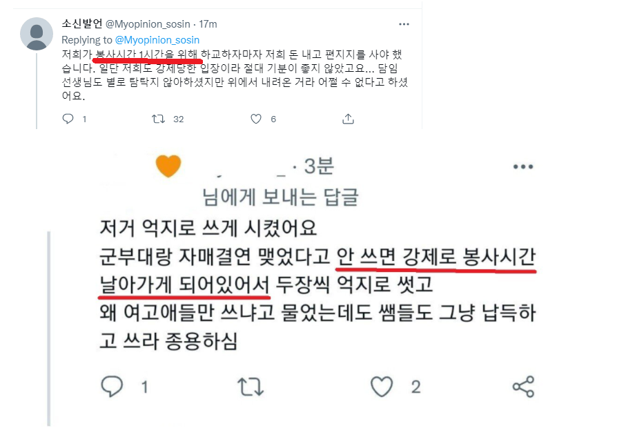 위문편지에 대한 가이드라인도 주어졌고 가이드라인을 봐도 문제 될 내용은 없고 매우 상식적인 내용인데 이것을 어기고 쓴 학생의 문제인데요. 기존 학생의 트위터 발언을 보니 페미라고 보입니다.